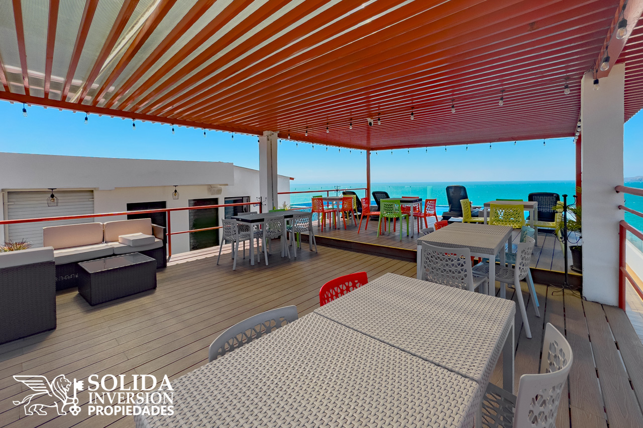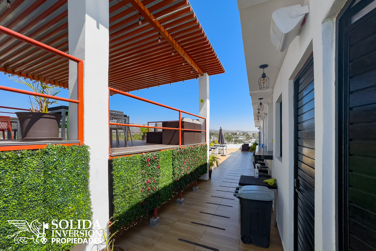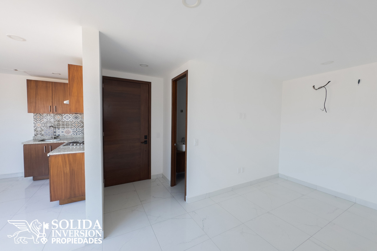 La propiedad cuenta con cocina integral con parrilla eléctrica, espacio para sala-comedor con acceso a balcón, área de lavado, baño completo común y una recámara con acceso directo a balcón. Se ubica en un tercer nivel, el edificio cuenta con elevador, rooftop con alberca, bar y restaurante.