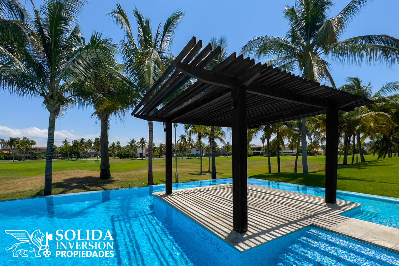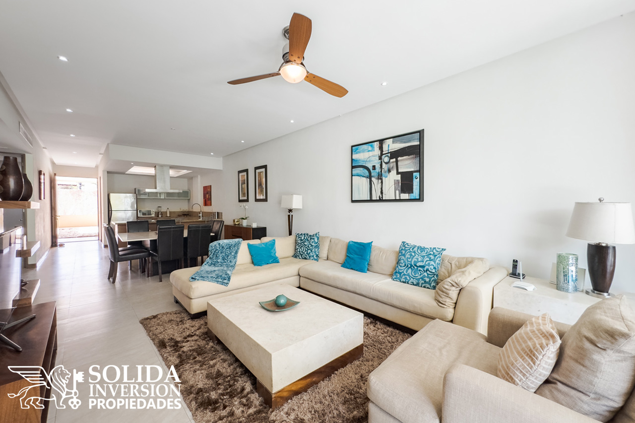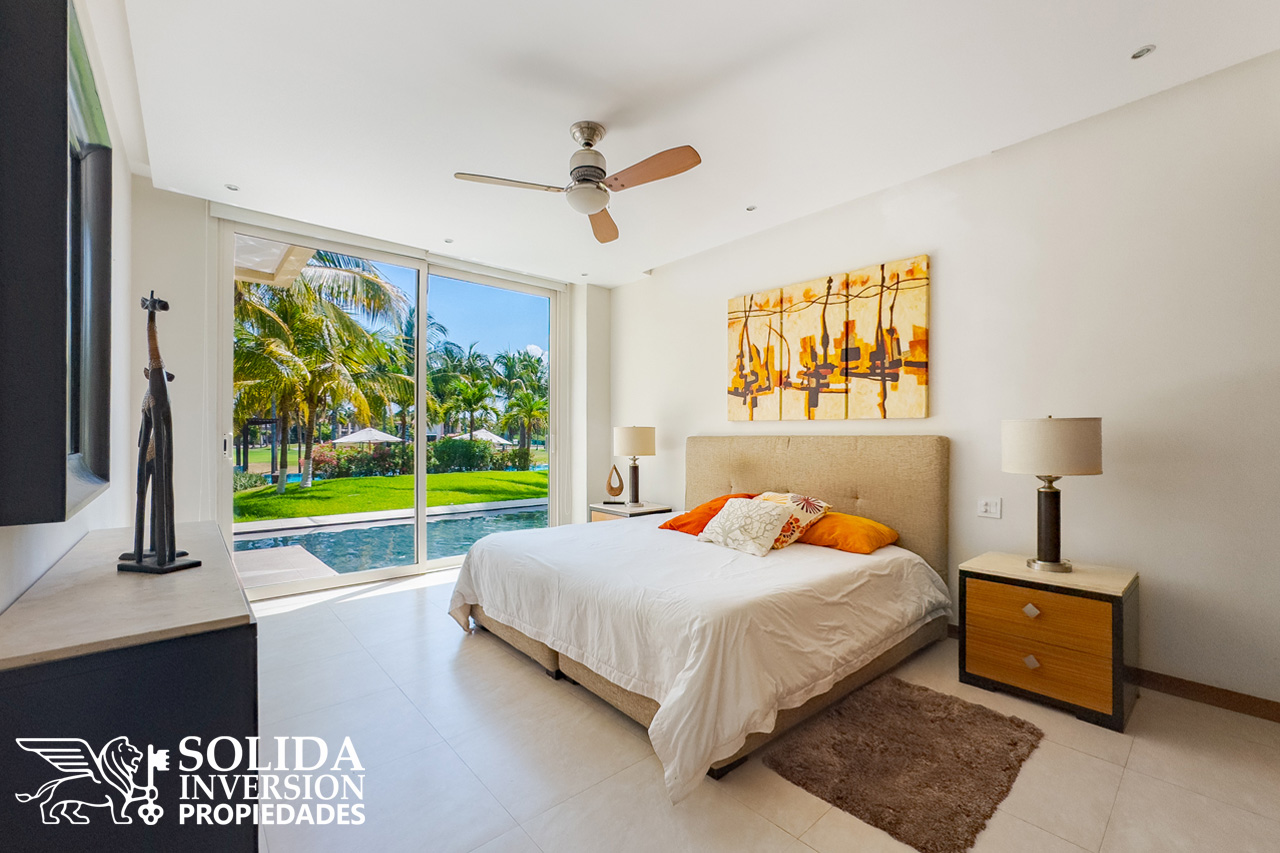 Con la comodidad que brinda una planta baja, rodeada de espejos de agua, este departamento ofrece agradables espacios abiertos, como la cocina integral con barra y campana, comedor y sala con acceso directo a una terraza techada al frente el departamento, con vista a la alberca y al campo de golf.