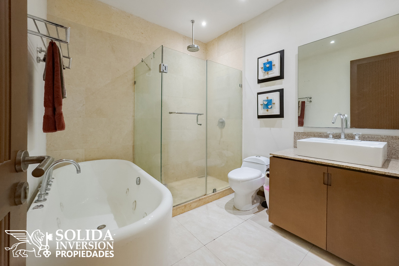 Al departamento también lo componen la recámara principal, con orientación al campo de golf, acceso directo a la terraza, clóset y baño completo con tina, y una recámara secundaria cual cuenta con clóset y se encuentra orientada hacia el interior del edificio. La propiedad se complementa con un baño completo en área social, cuarto de lavado y estacionamiento subterráneo para un auto.