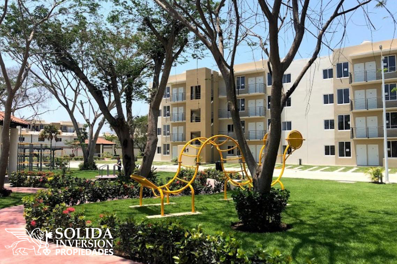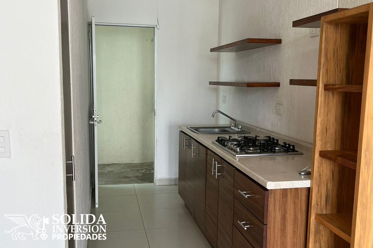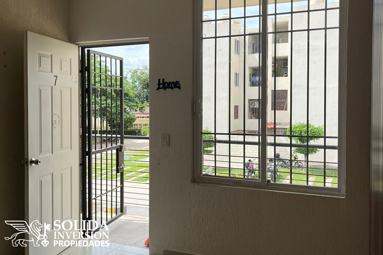El departamento cuenta con cocina integral, espacios para sala-comedor, recámara principal y recámara secundaria, ambas con clósets, baño completo común, aires acondicionados en recámaras, ventiladores de techo, área de lavado cubierta y estacionamiento para un auto. Se ubica en un primer nivel.