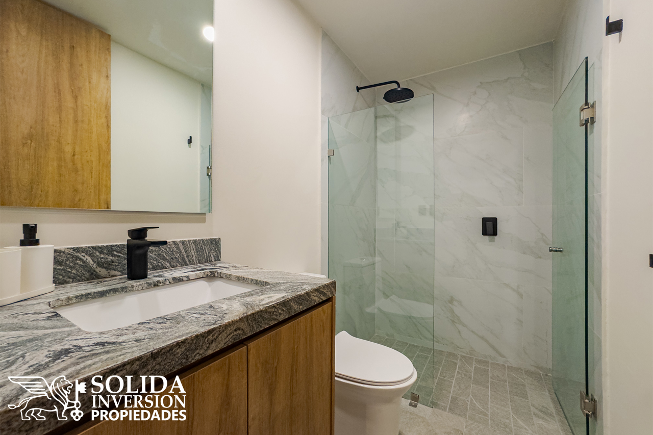 El departamento 205 modelo 2RA*, cuenta con cocina integral con barra, sala y comedor con acceso a terraza, recámara principal con walkin clóset y baño completo, recámara secundaria con clóset, baño completo común, área de lavado y estacionamiento subterráneo para un auto. Se ubica en un segundo nivel*, con acceso por elevador y escaleras.