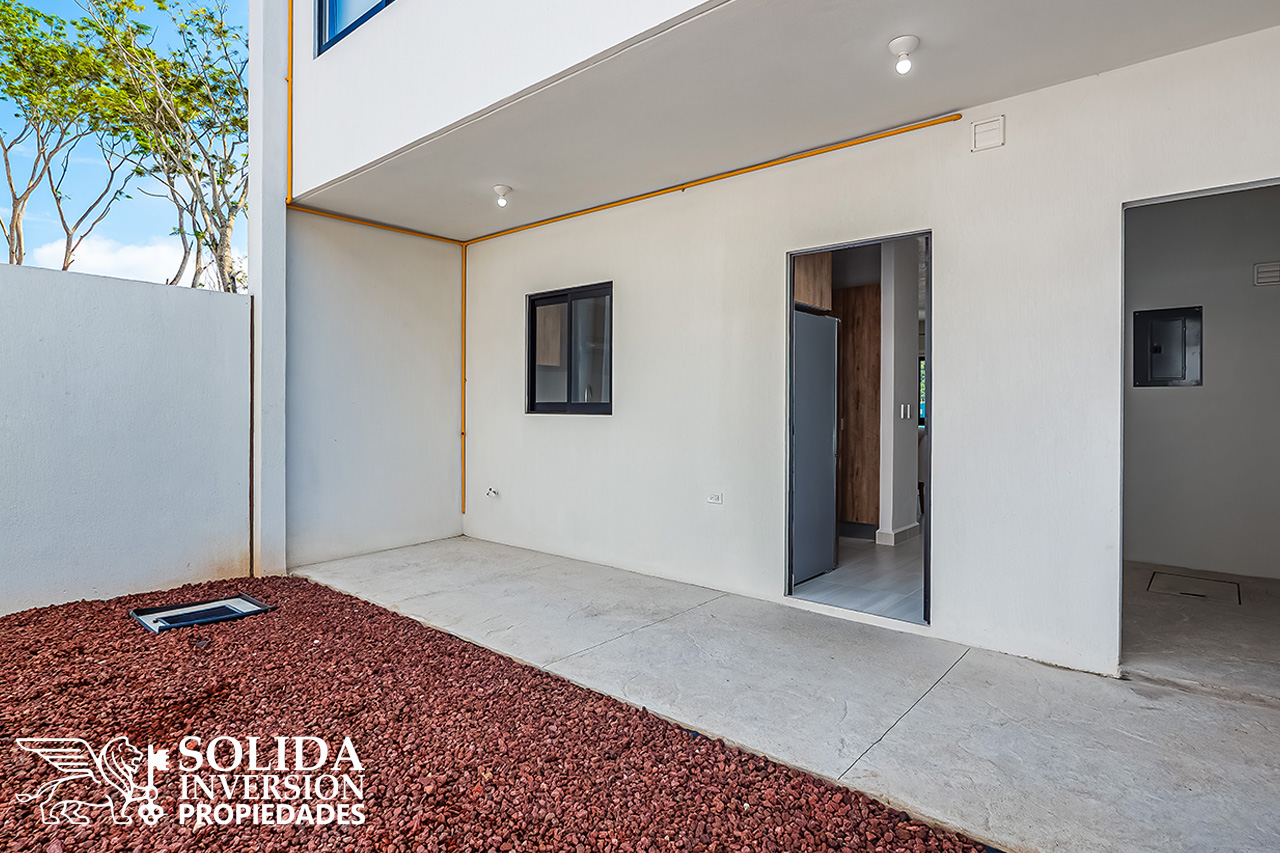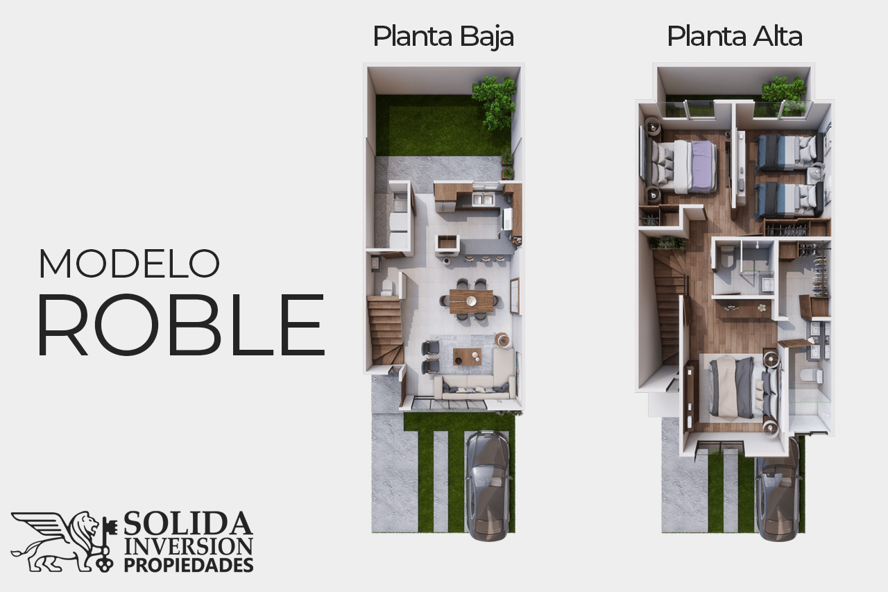 La casa 419*, modelo Roble*, cuenta con tres recámaras, dos baños completos y un medio baño, así como un amplio espacio para la sala y comedor, cocina integral con barra y alacena, cuarto de servicio independiente y patio trasero con terraza techada.