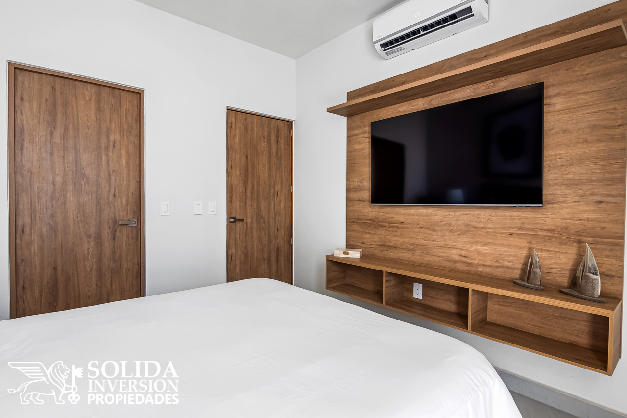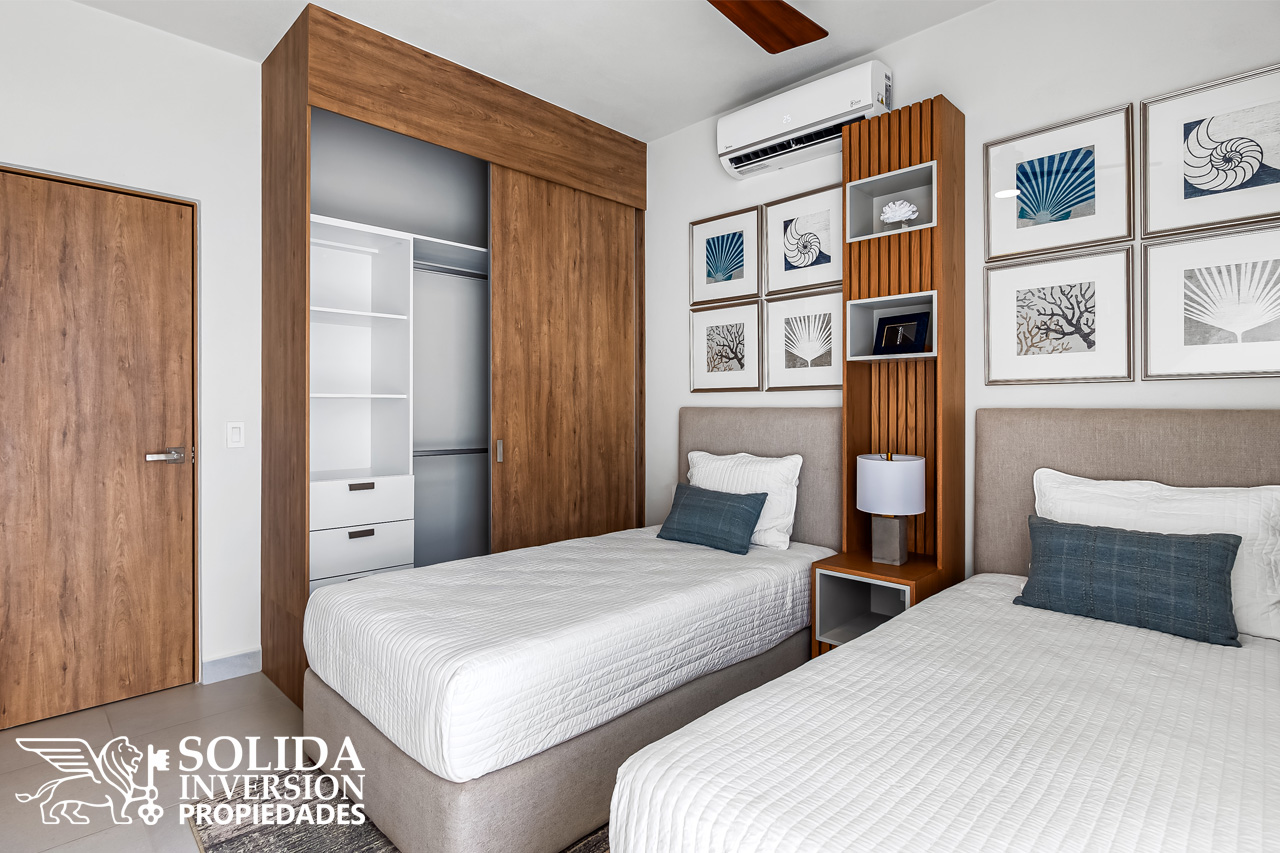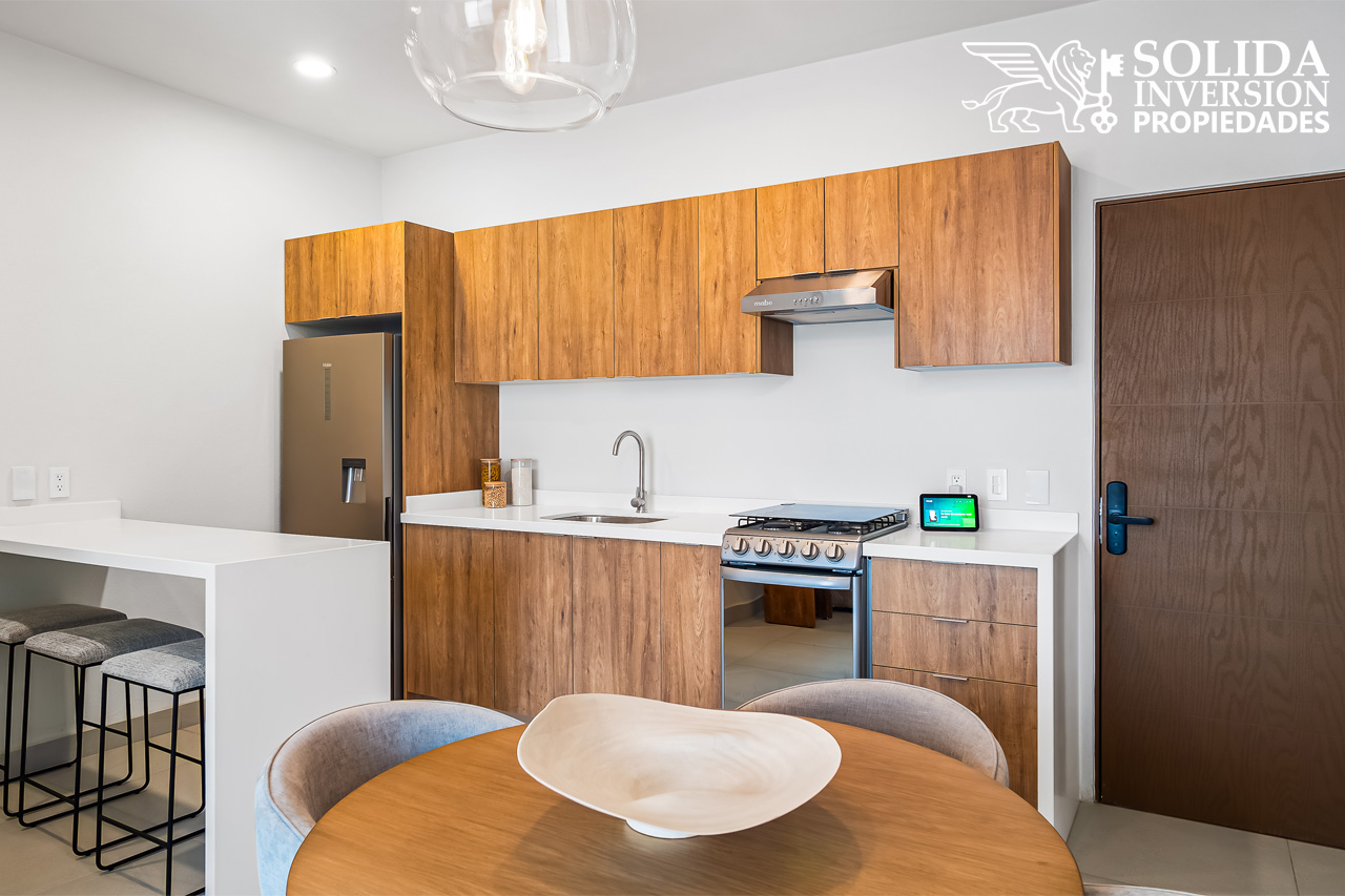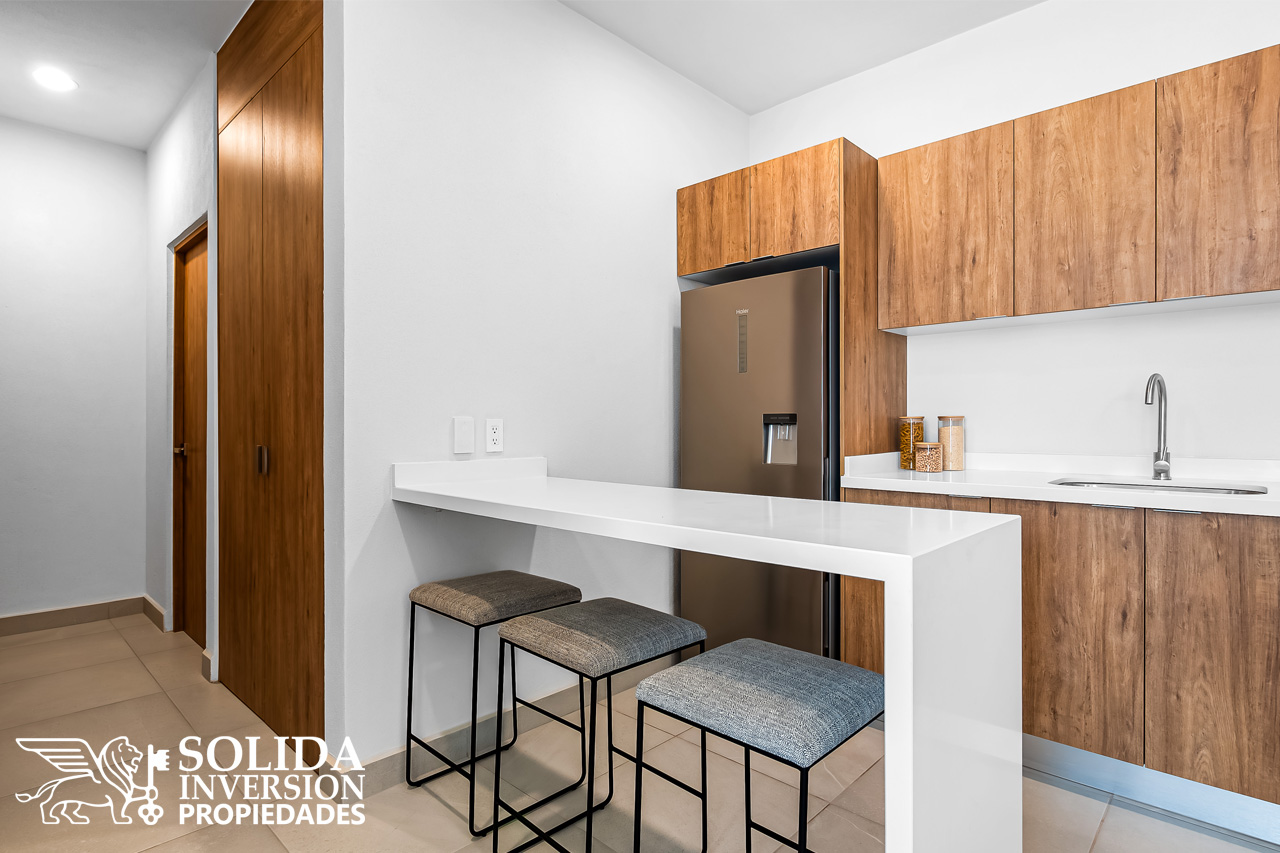 El departamento 2316*, modelo con Terraza B, cuenta con dos recámaras y dos baños completos, además de cocina integral con barra y alacena, sala comedor, área de lavado y un cajón de estacionamiento sin techar. Ubicado en un cuarto nivel*