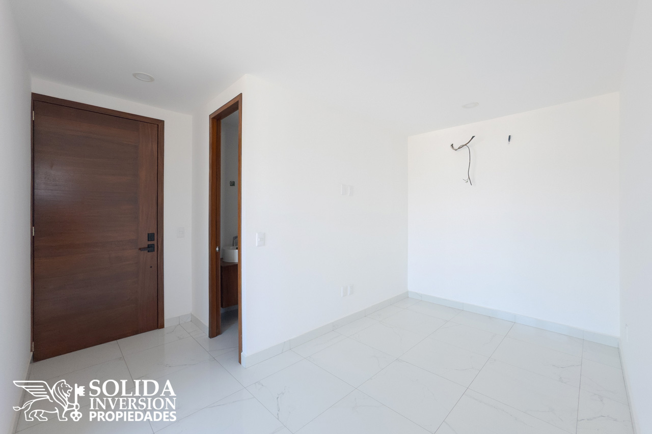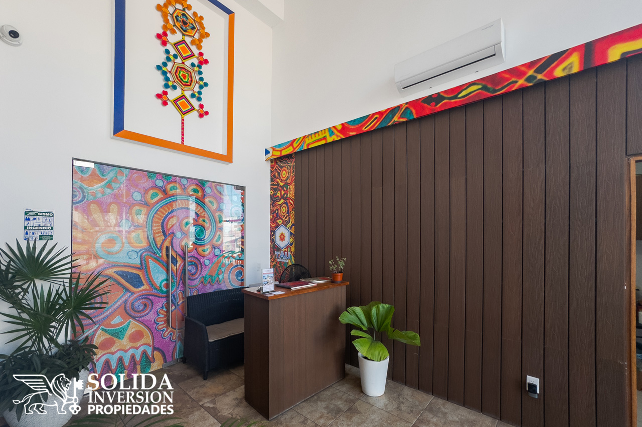 La propiedad cuenta con cocina integral con parrilla eléctrica, espacio para sala-comedor con acceso a balcón, área de lavado, baño completo común y una recámara con acceso directo a balcón. Se ubica en un tercer nivel, el edificio cuenta con elevador, rooftop con alberca, bar y restaurante.