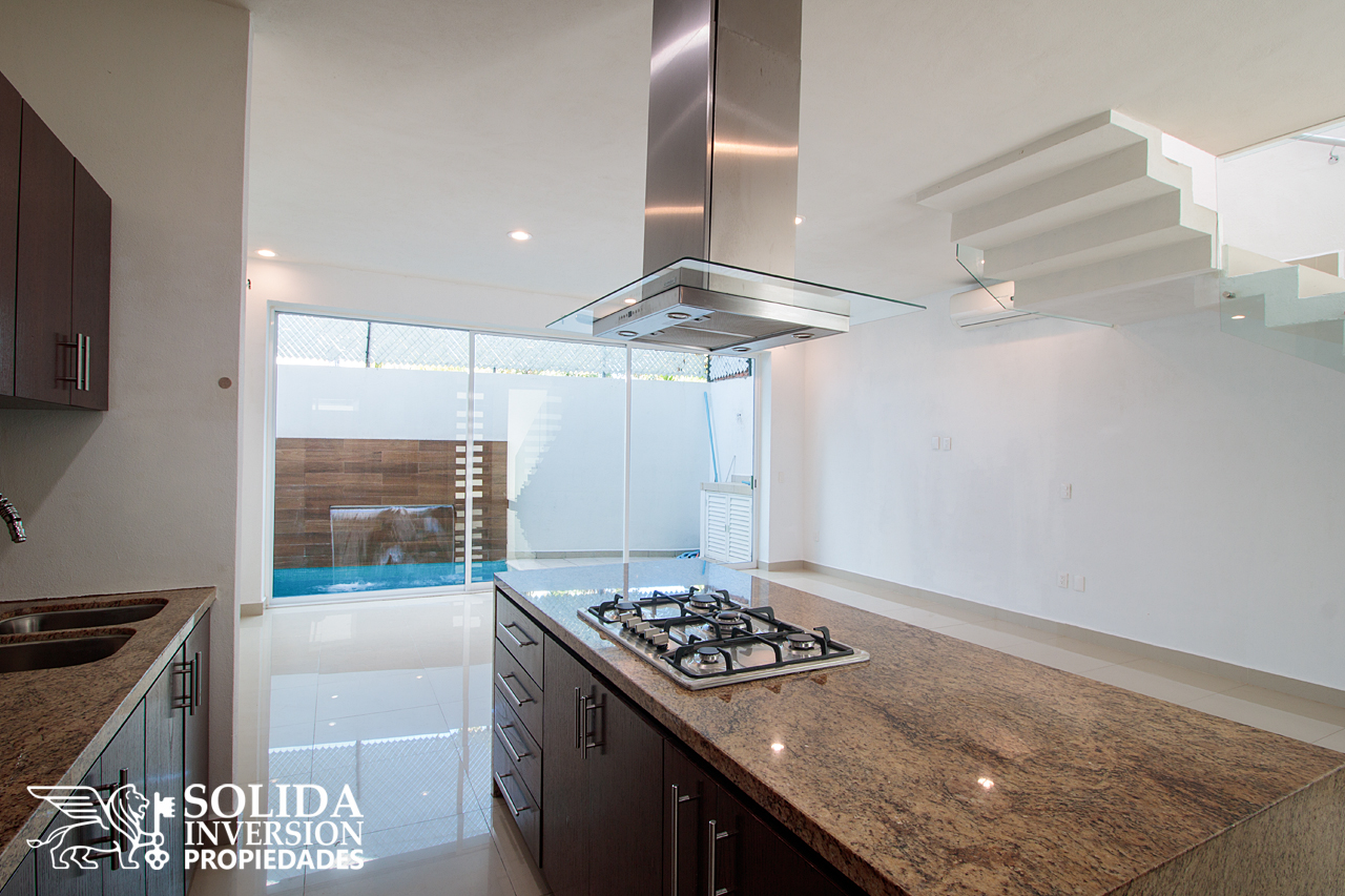La casa LAGO ERIE cuenta en planta baja con gran espacio para sala y comedor, cocina integral abierta con barra, medio baño para área social, cuarto de lavado, patio trasero con alberca y fuente, además de cochera semi techada para dos autos, con portón eléctrico.
