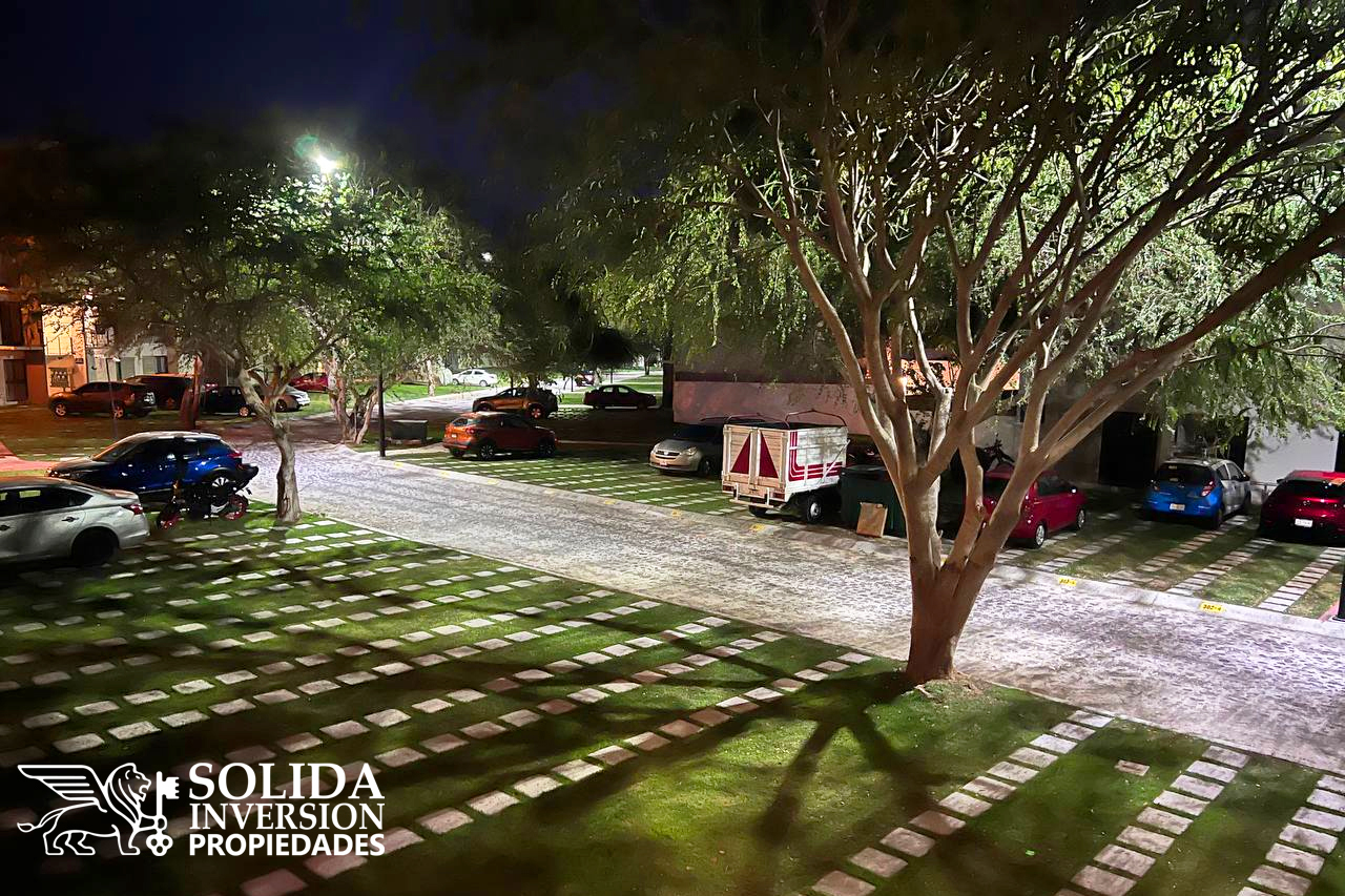 El departamento se ubica en un primer nivel, cuenta con dos recámaras, un baño completo, cocina integral con barra, comedor, sala con acceso a balcón, área de lavado y estacionamiento para un auto, a nivel de calle.