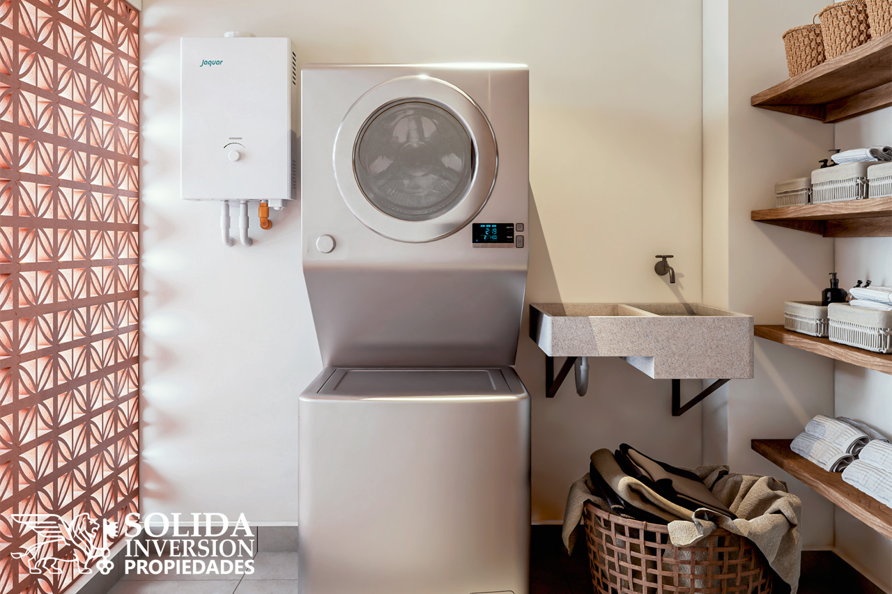 El departamento también se integra por una recámara principal con baño completo y espacio para vestidor-clóset, una recámara secundaria con baño completo y espacio para clóset, un medio baño en área social, área de lavado cubierta con espacio para clóset de blancos y estacionamiento para dos autos.