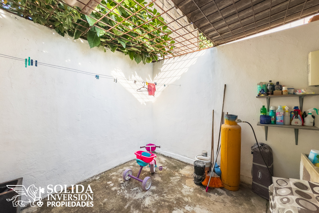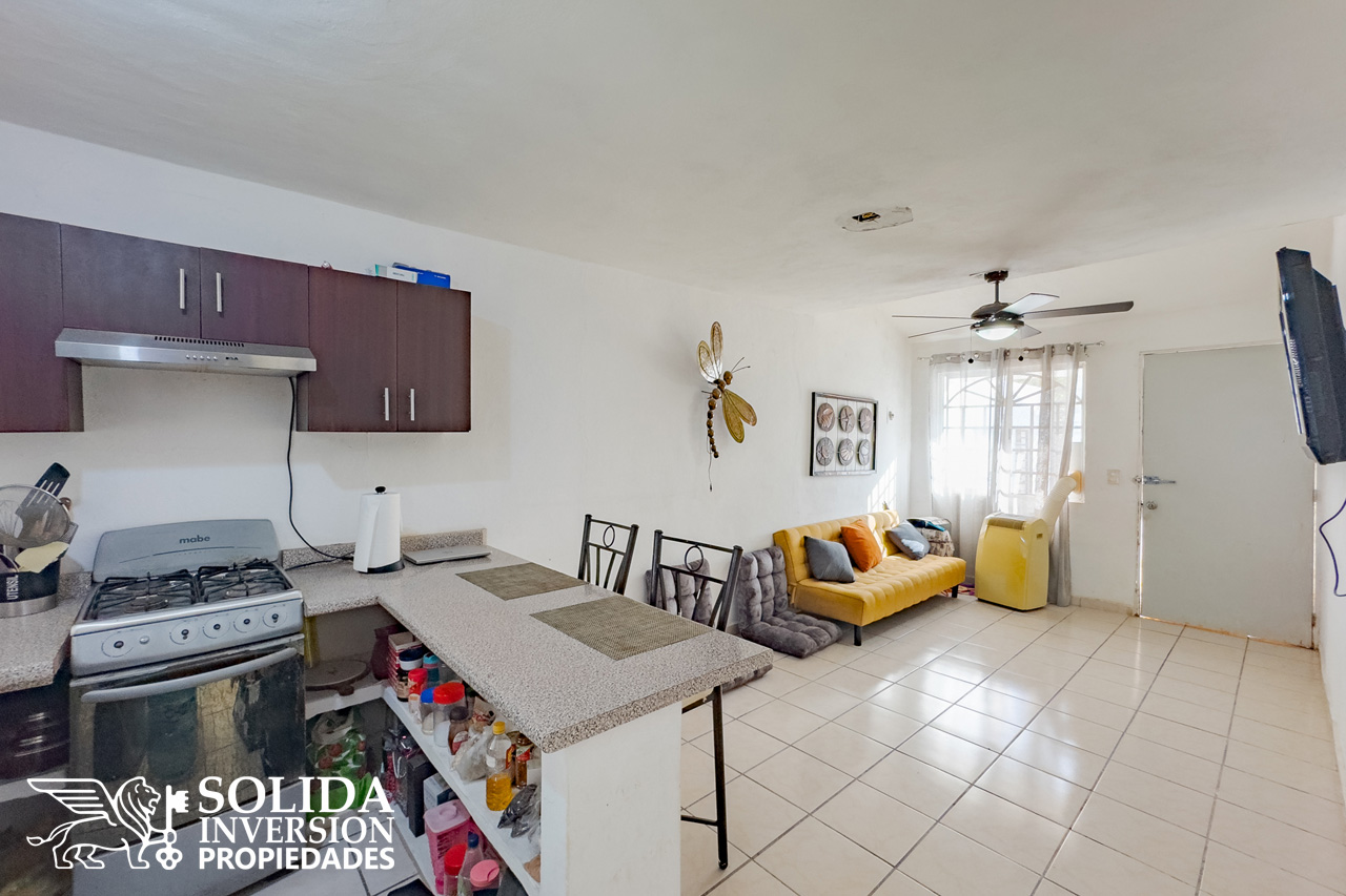 Distribuido en un solo nivel, la casa cuenta con cocina integral con barra, espacios para sala y comedor, recámara principal con clóset, recámara secundaria con repisa en área de clóset, baño completo, patio trasero con área de lavado cubierta, estacionamiento para un auto, bardas laterales al frente y preparación para portón.