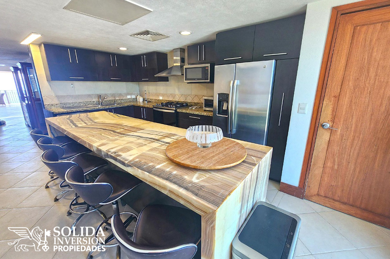 La propiedad de cuatro recámaras, se integra por un área central con vista directa al mar, donde se encuentran la sala y el comedor, este espacio es iluminado naturalmente por ventanas deslizantes que comunican directamente a su balcón. La cocina integral con isla, se sitúa en el lado opuesto del departamento, con vista hacía la ciudad y las montañas.