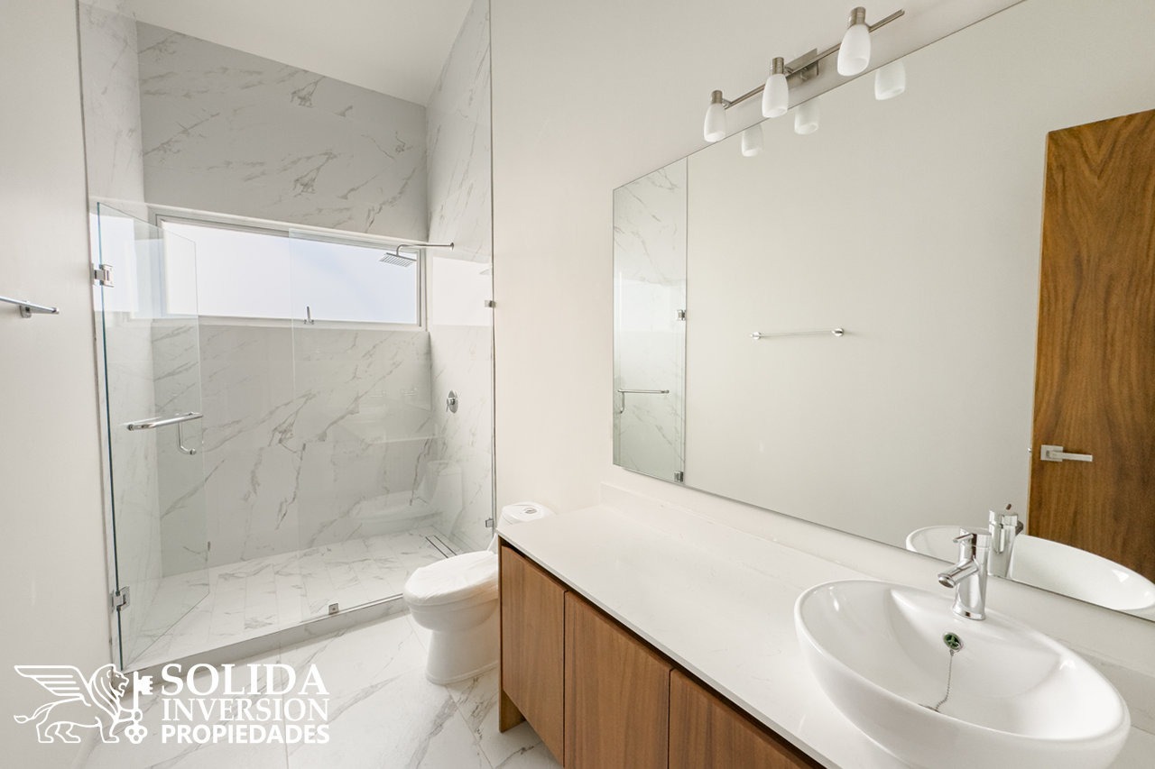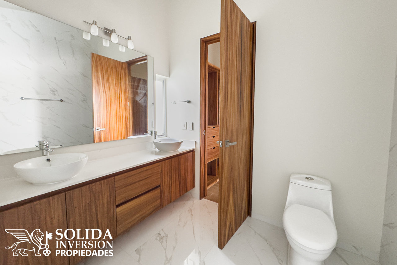 En la planta alta se ubica la recámara principal con balcón, walkin clóset y su baño completo de doble lavabo, así como dos recámaras secundarias con clósets y baños completos.