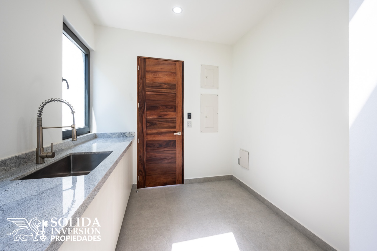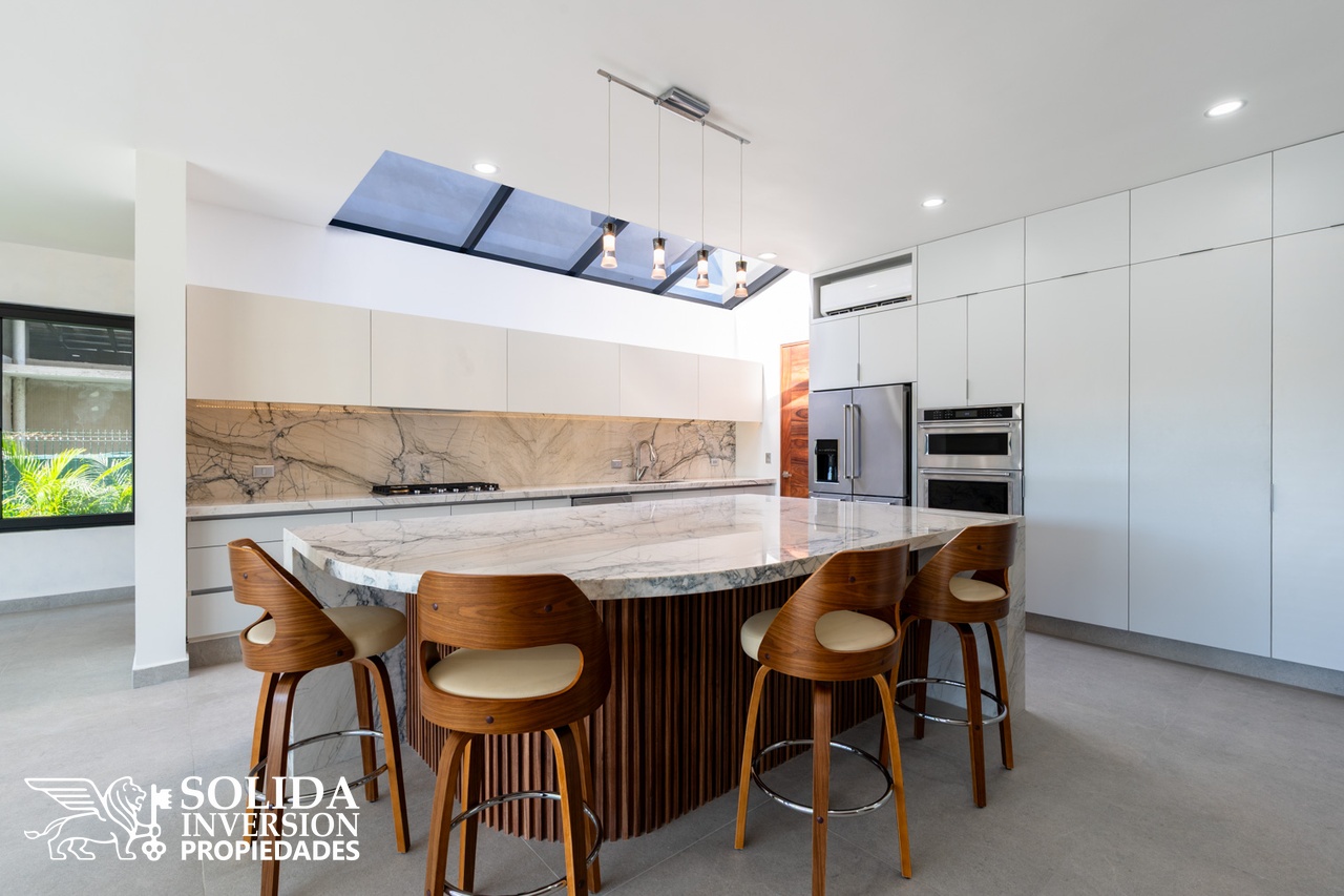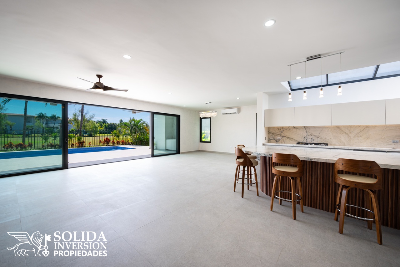 En su planta baja, la casa se compone por una amplia y luminosa cocina abierta con una gran isla y equipamiento KitchenAid, un gran espacio para la sala y el comedor, con acceso directo a la espectacular terraza con vista al campo de golf, grill y alberca. En este mismo nivel, se encuentra un estudio con baño completo.