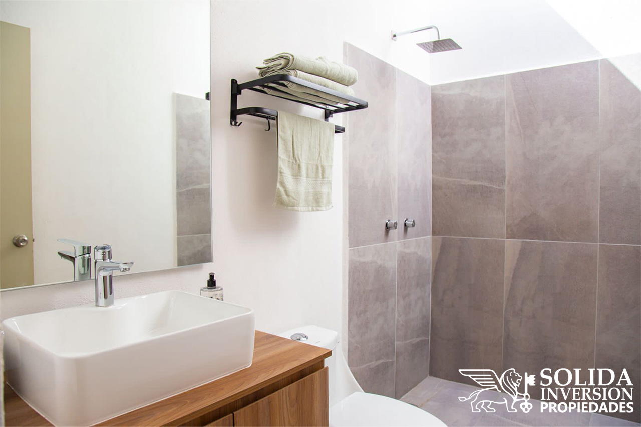 En dos niveles la casa 24*, cuenta con cocina integral, comedor y sala con aire acondicionado, patio trasero con pasillo lateral y área de lavado, recámara secundaria en planta baja, con espacio para clóset y preparación para aire acondicionado, además de un baño completo en el área social.