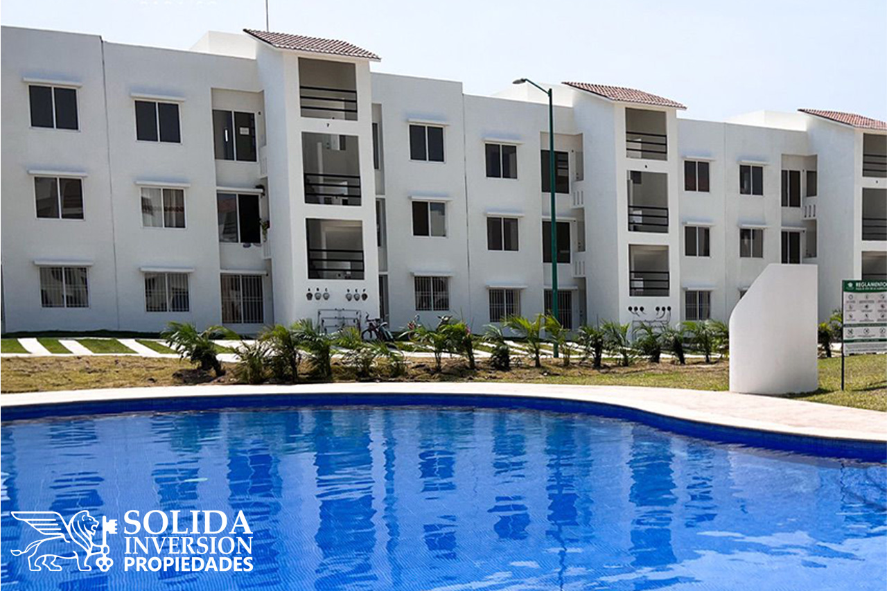 El departamento 504-05D* ubicado en un tercer nivel*, cuenta con espacios para cocina, comedor, sala, recámara principal y recámara secundaria,ambas con espacio para clósets, además de baño completo común, área de lavado y estacionamiento para un auto. Cuenta con alberca y palapa, en su área común.