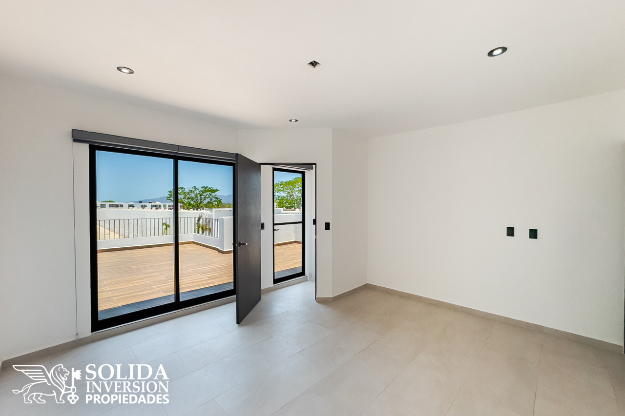 La recámara principal se ubica en el tercer nivel, lo cual le permite tener amplitud de espacio, al igual que el baño, que cuenta con doble lavabo y generoso espacio para su walkin clóset. En este mismo nivel, aparece una gran terraza con acceso directo desde la recámara ppal y acceso adicional desde la escalera.