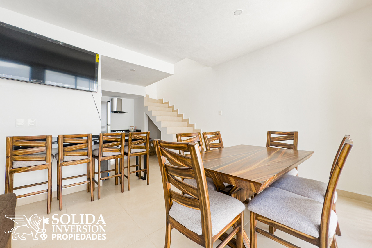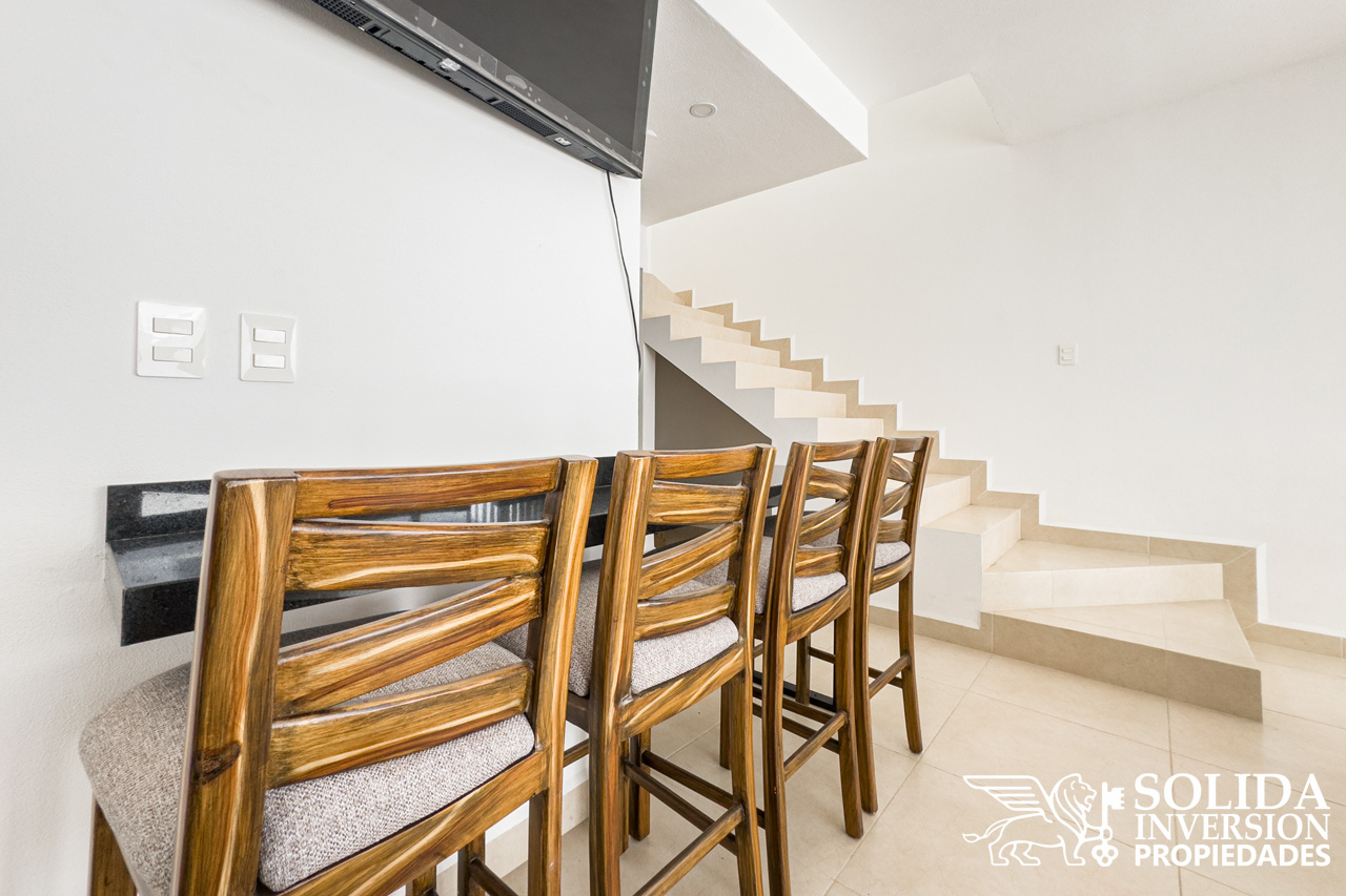 La casa VEREA | PARAÍSO cuenta en su planta baja con una cocina integral, barra desayunadora, comedor y sala con acceso directo al patio trasero y medio baño para el servicio del área social.