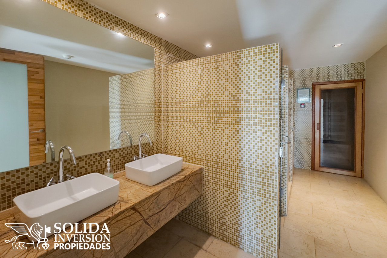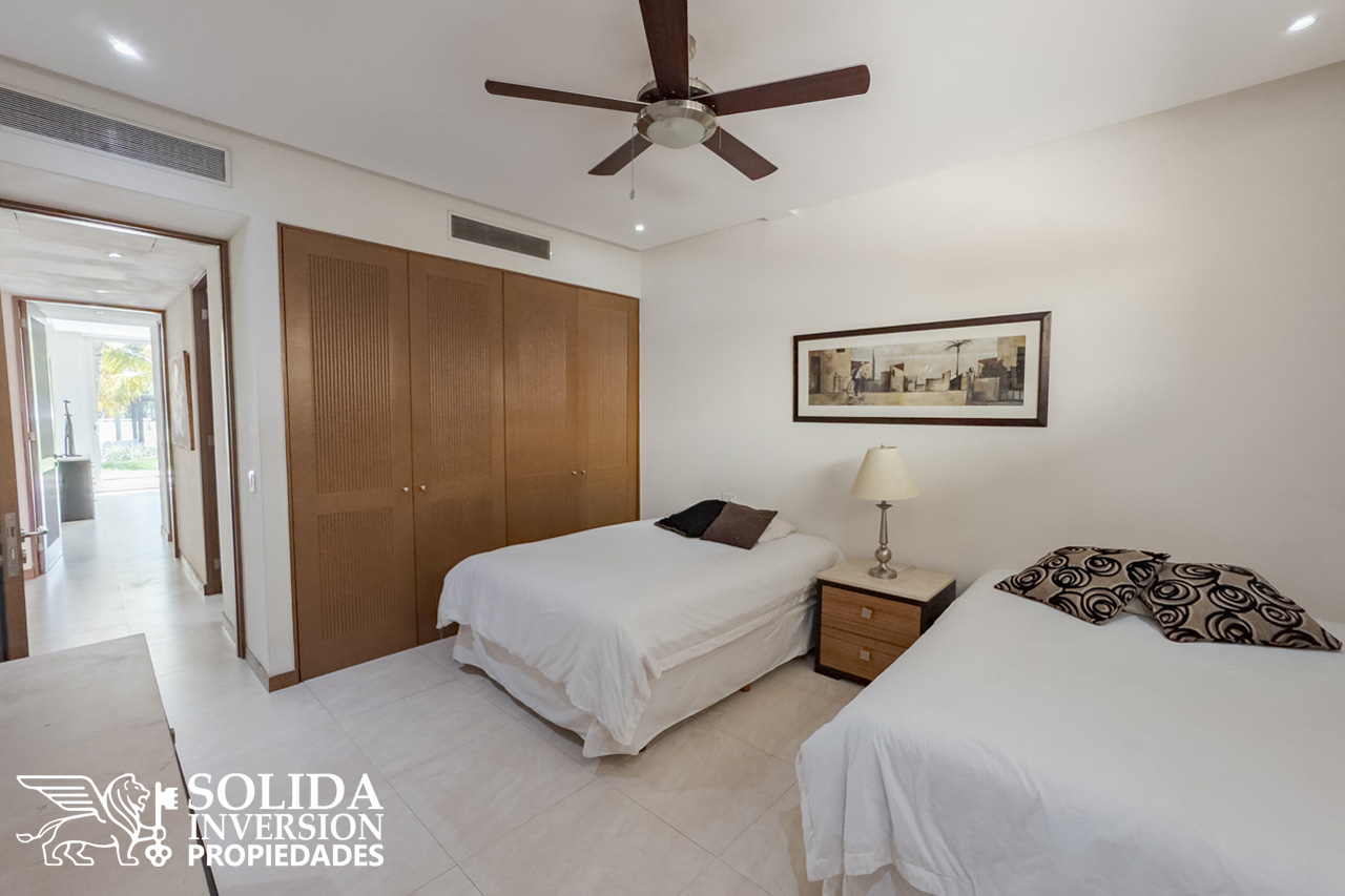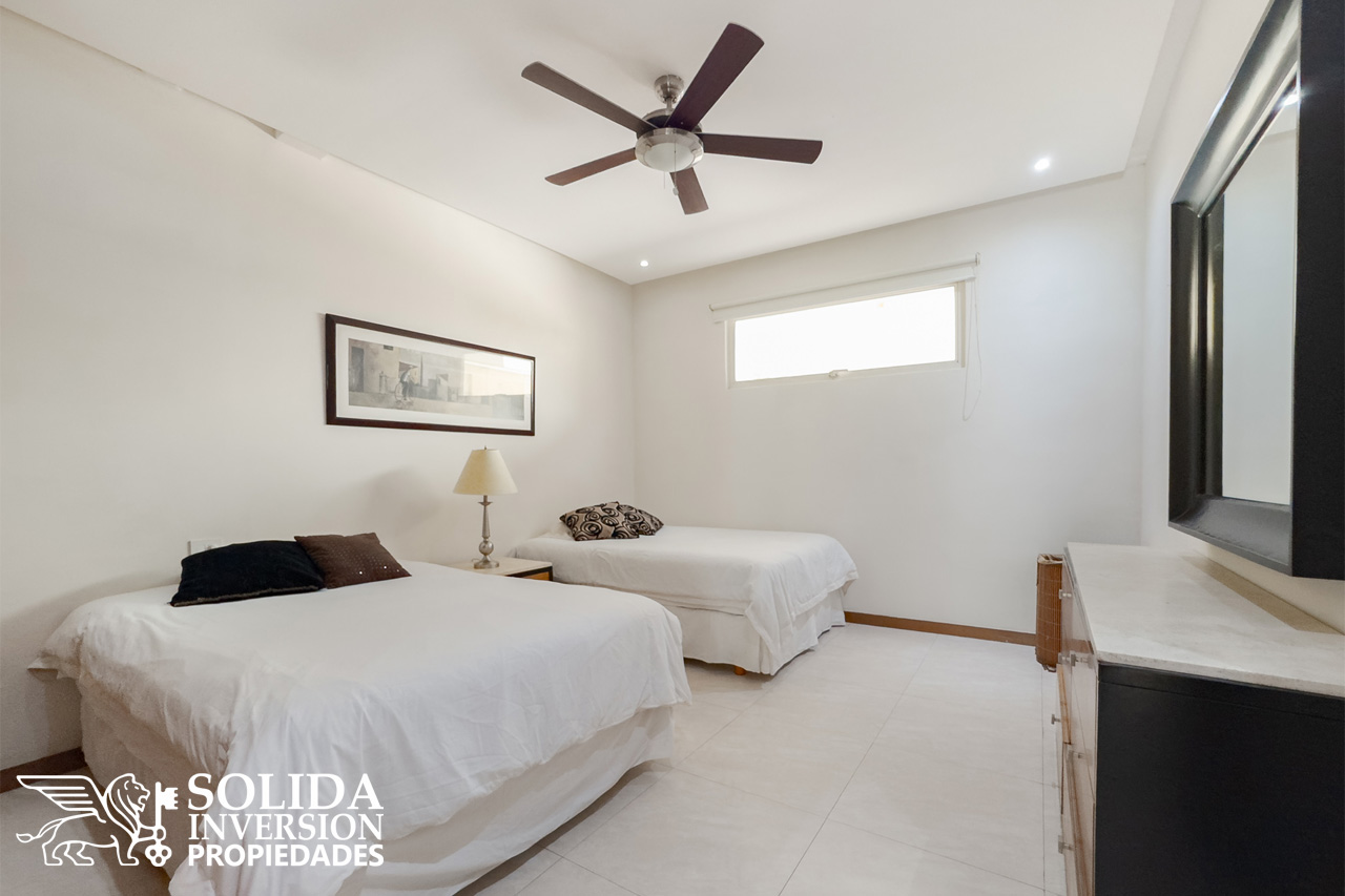 Al departamento también lo componen la recámara principal, con orientación al campo de golf, acceso directo a la terraza, clóset y baño completo con tina, y una recámara secundaria cual cuenta con clóset y se encuentra orientada hacia el interior del edificio. La propiedad se complementa con un baño completo en área social, cuarto de lavado y estacionamiento subterráneo para un auto.