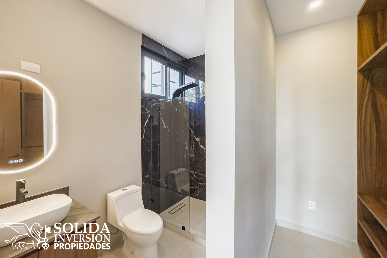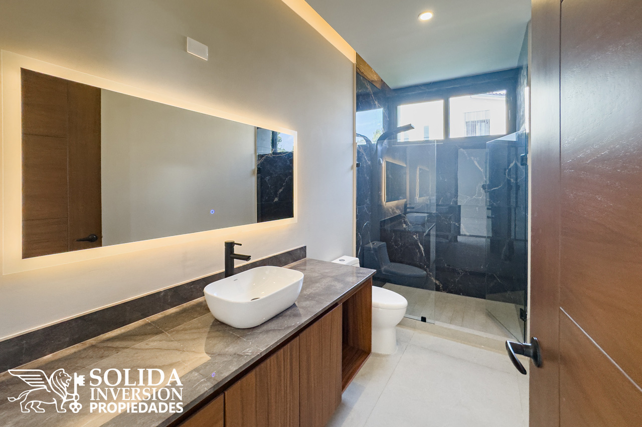 En la planta alta se ubica una sala de estar, la recámara principal con balcón, walkin clóset y baño completo de doble lavabo, así como dos recámaras secundarias con walkin clósets y baños completos.