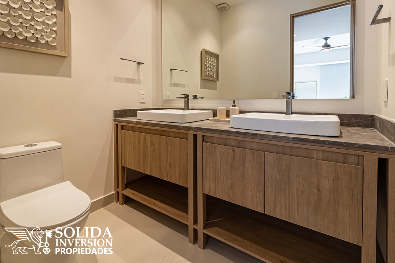 En BÁLICA, las viviendas cuentan con cocinas equipadas con tarja y monomando de alta calidad en acabado negro mate, y en los baños se incluyen accesorios como toalleros y sanitarios cerámicos tipo one piece con tapa de cierre lento. Además, se instalan monomandos y regaderas con los mismos acabados, brindando un aspecto uniforme y elegante en todo el hogar.