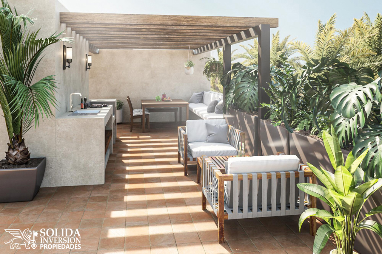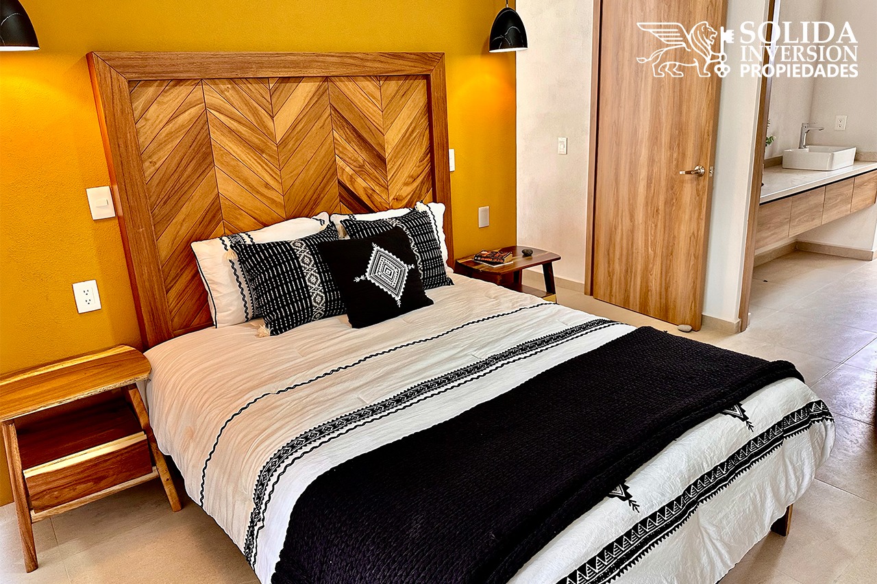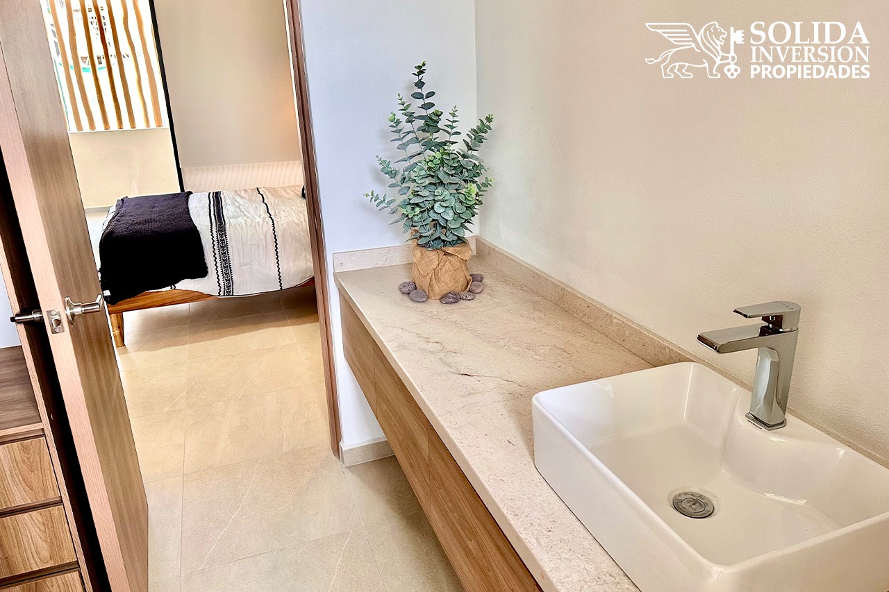 El departamento A-22 modelo Palmito*, cuenta con dos recámaras y dos baños completos. Ubicado en un segundo nivel.