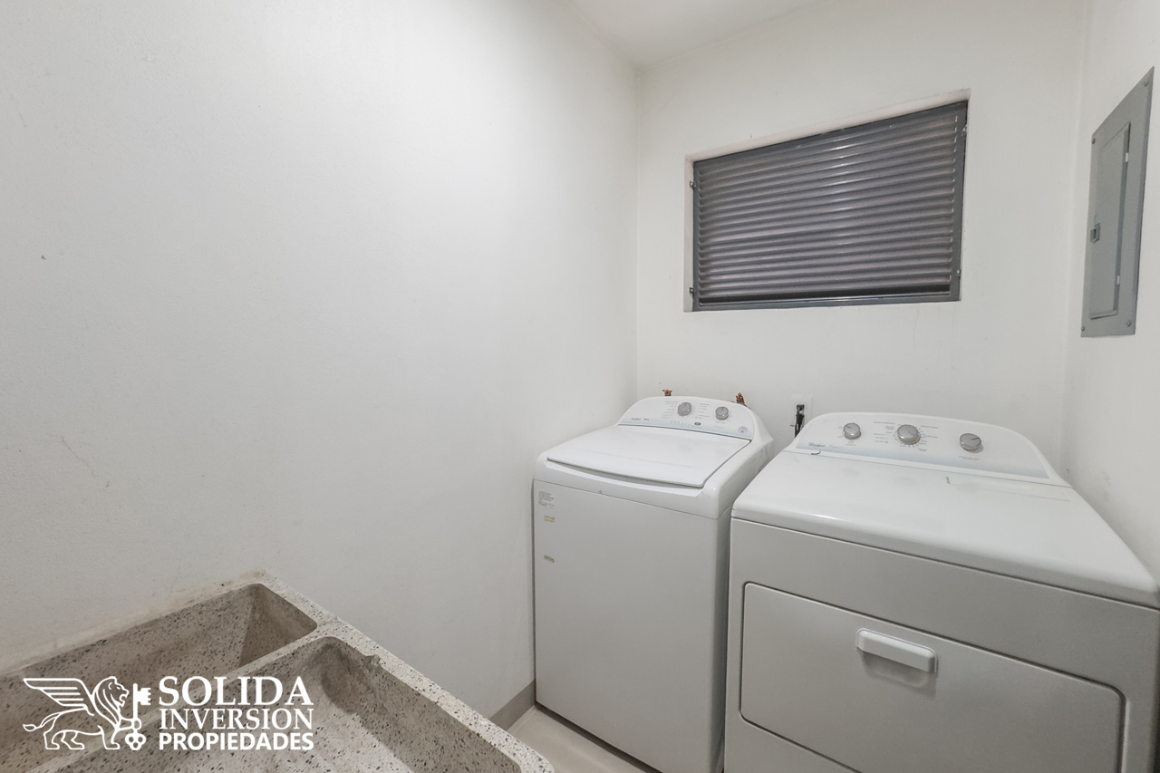 La casa cuenta con estacionamiento al frente, para dos autos, cuarto de lavado, aires acondicionados y ventiladores de techo.