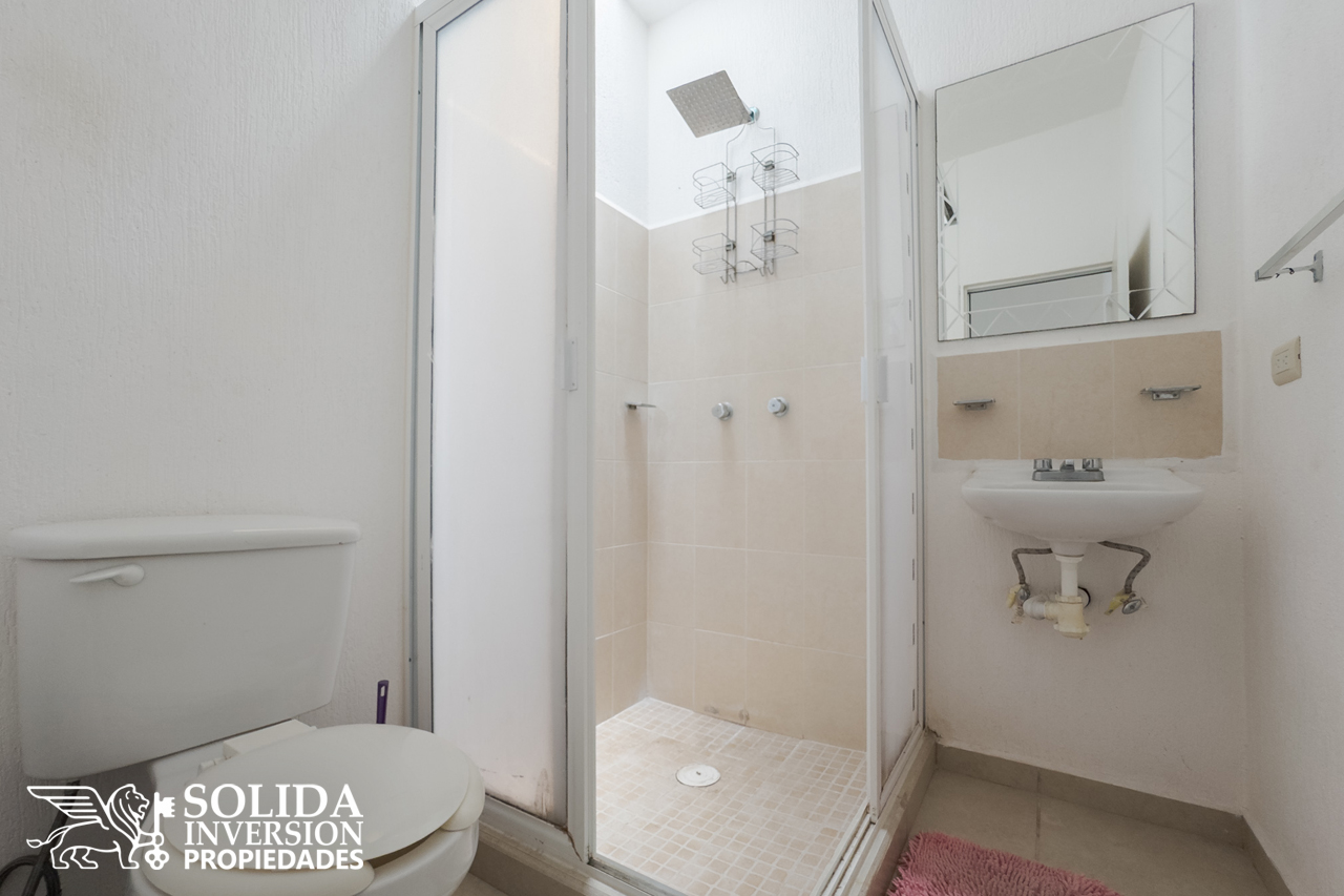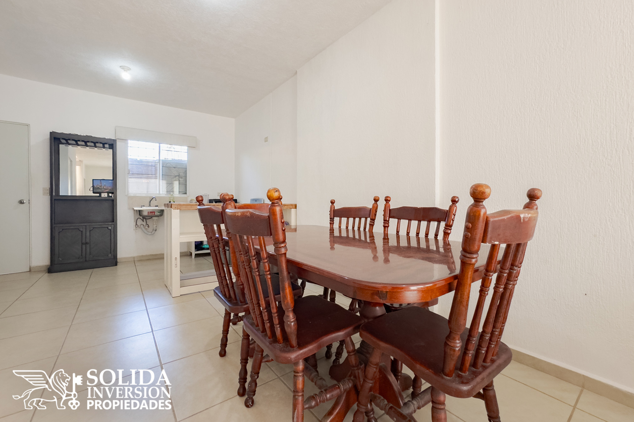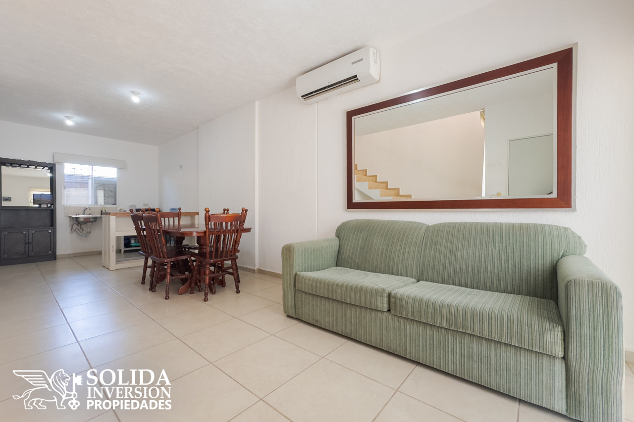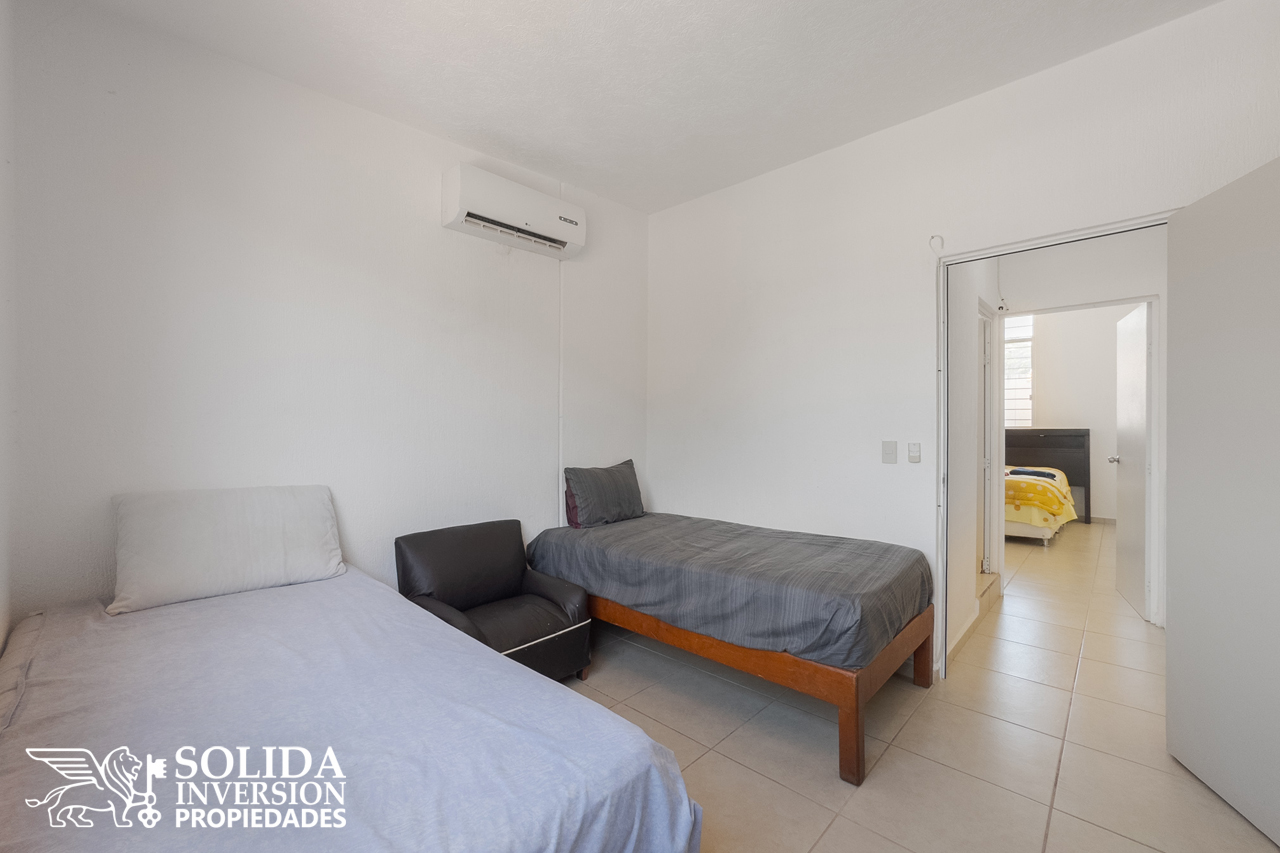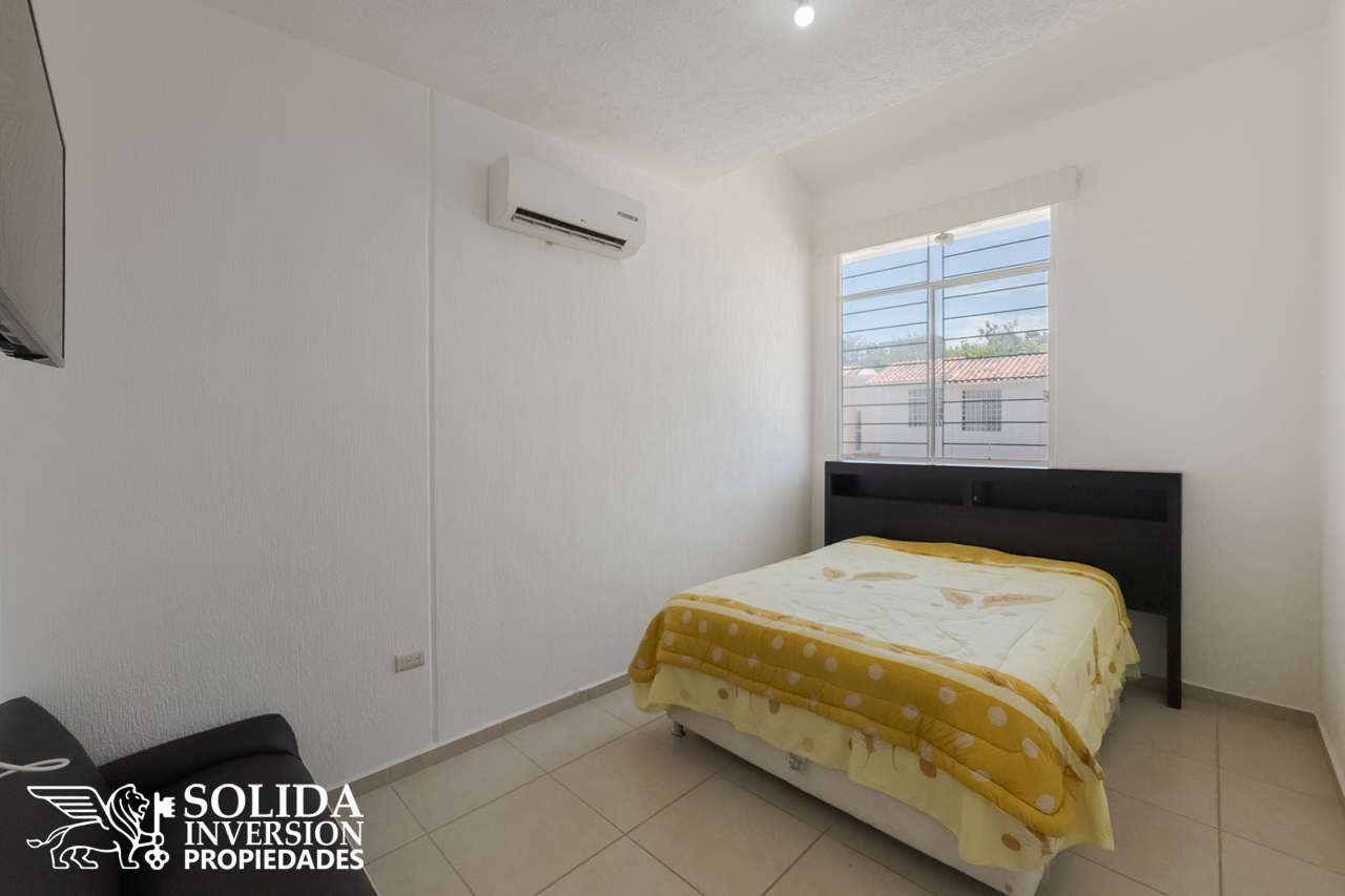 La casa cuenta en su planta baja, con espacios para cocina, sala y comedor con aire acondicionado, un medio baño para el área social y patio de servicio cubierto con área de lavado. En la planta alta se ubica la recámara principal con aire acondicionado, la recámara secundaria con clóset y aire acondicionado, así como un baño completo para el servicio de las dos recámaras.