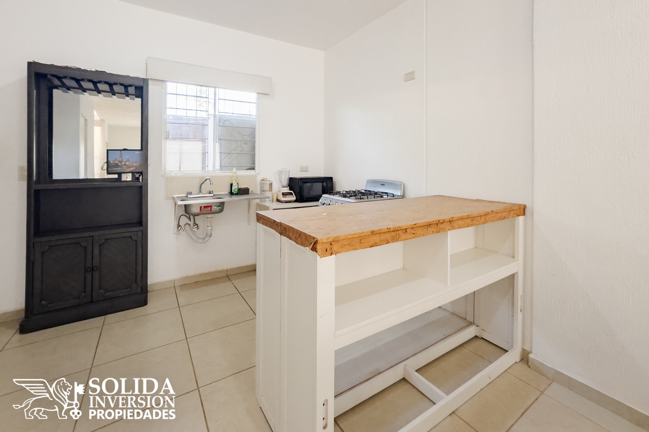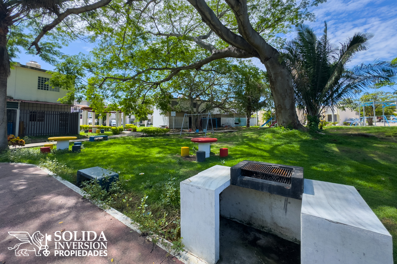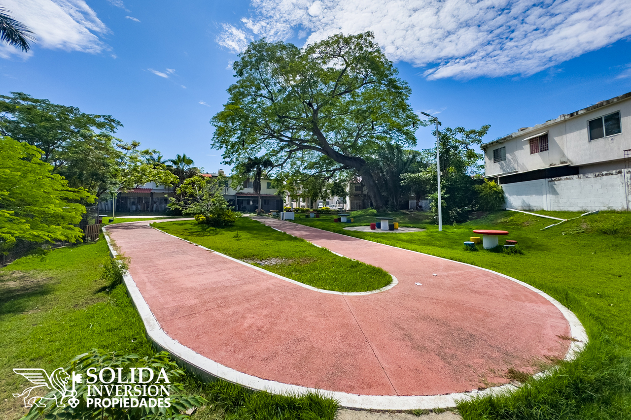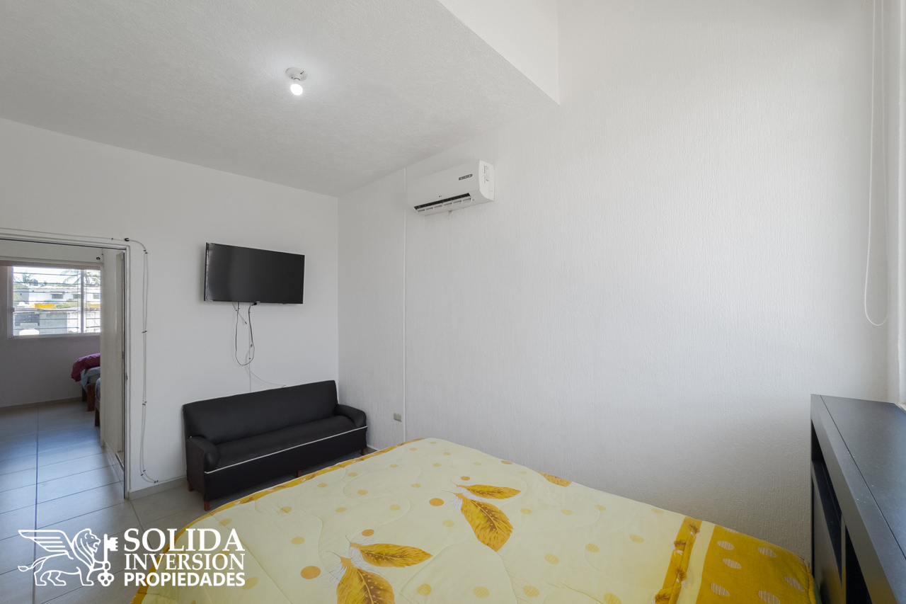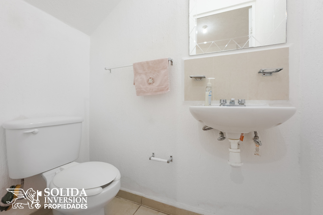 La casa cuenta en su planta baja, con espacios para cocina, sala y comedor con aire acondicionado, un medio baño para el área social y patio de servicio cubierto con área de lavado. En la planta alta se ubica la recámara principal con aire acondicionado, la recámara secundaria con clóset y aire acondicionado, así como un baño completo para el servicio de las dos recámaras.